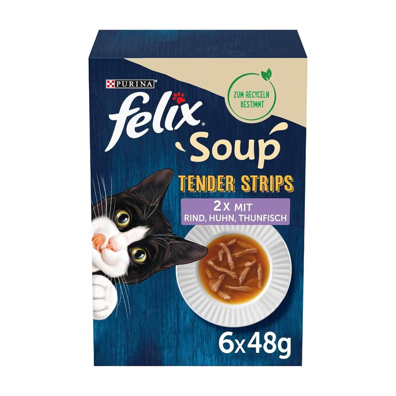 FELIX – Soup Tender Strips Gemischte Vielfalt mit Rind, Huhn & Thunfisch 8x 6x 48g – Ergänzungsfuttermittel für ausgewachsene Katzen – Hoher Feuchtigkeitsgehalt