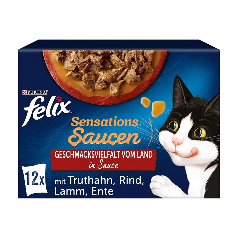 FELIX Sensations Saucen Nassfutter für Katzen Land-Vielfalt, 12 x 85g – Zarte Stückchen in aromatischer Sauce, Verschiedene Fleischsorten