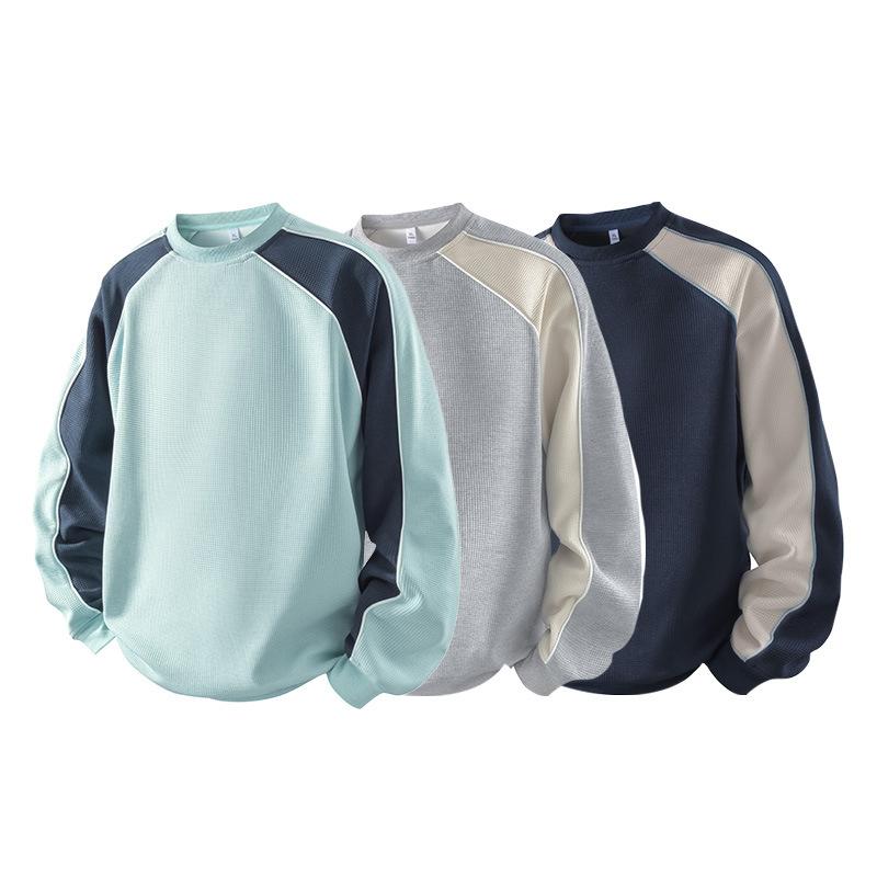 Men's Color Block Raglan Sleeve Sweatshirt - Waffle Knit Crew Neck Pullover with Contrast Piping Detail cm navy blue