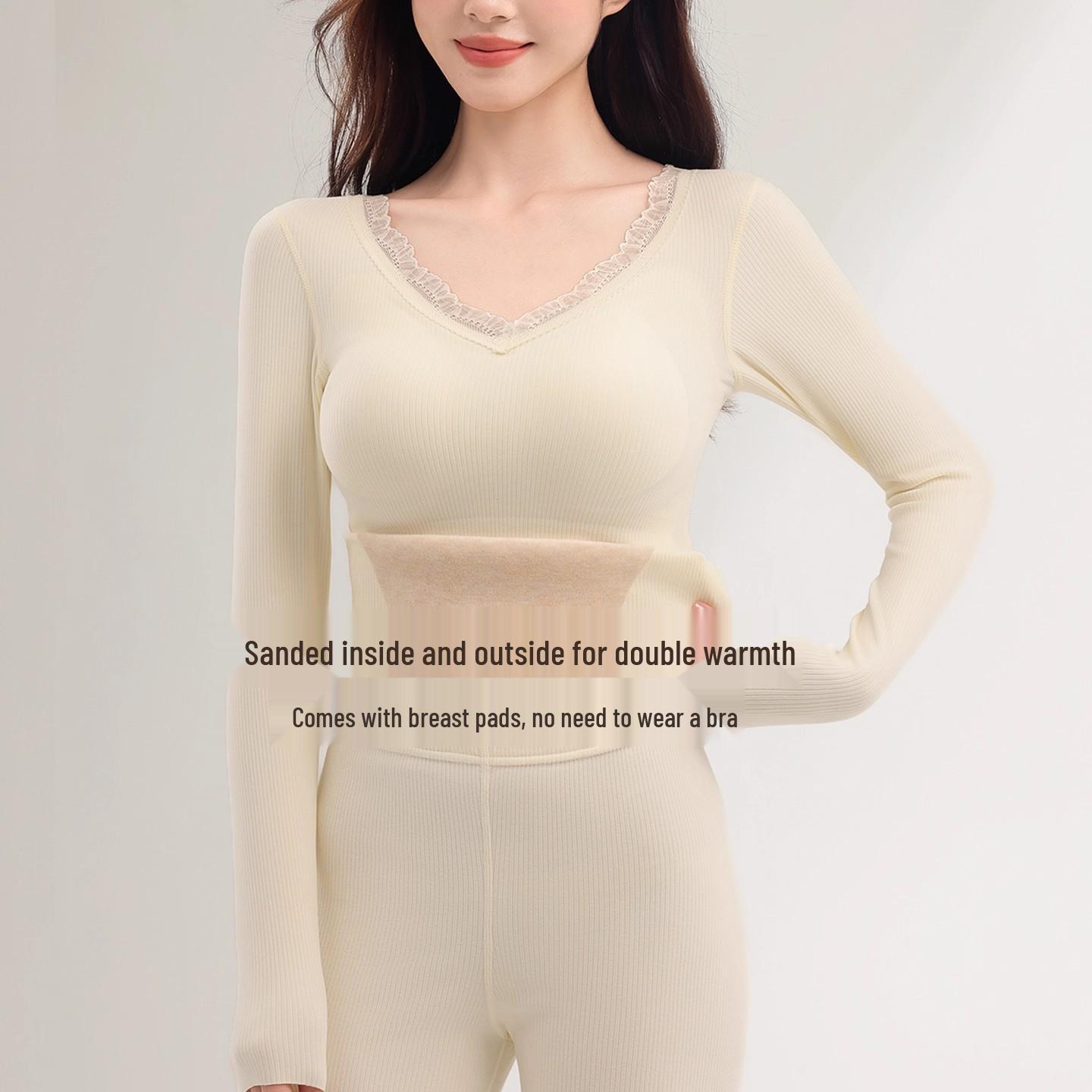 Damen Kaschmir Seide Warmes Unterwäsche Set: Herbst-/Winterstil, Mit Samt gefüttert, Verdickt, Antibakteriell, Basis-Shirt & BH-Kombination. cm