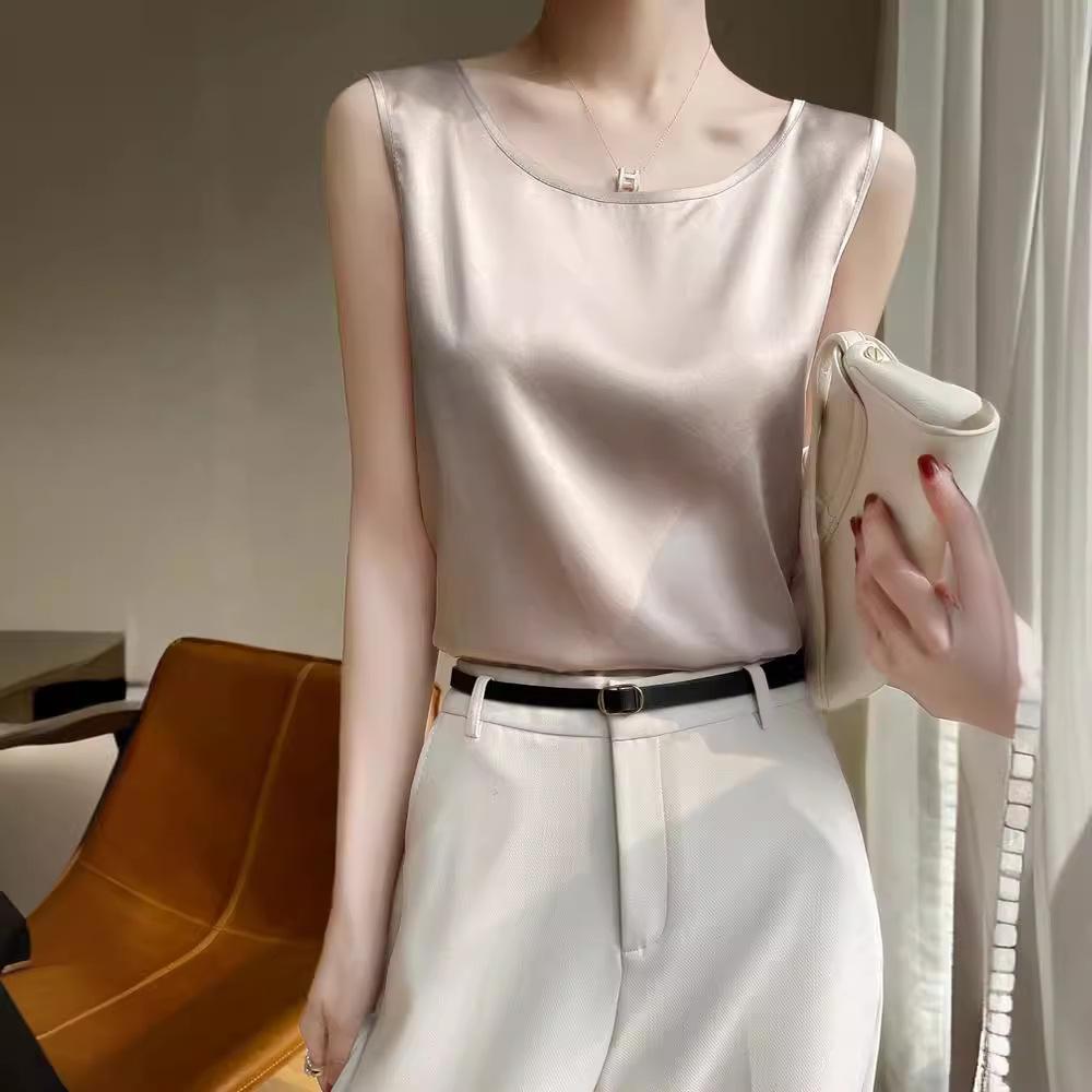 Damska Kamizelka Bez Rękawów z Jedwabiu Morwowego Plus Size – Luźny Satynowy Top na Ramiączkach z Okrągłym Dekoltem cm