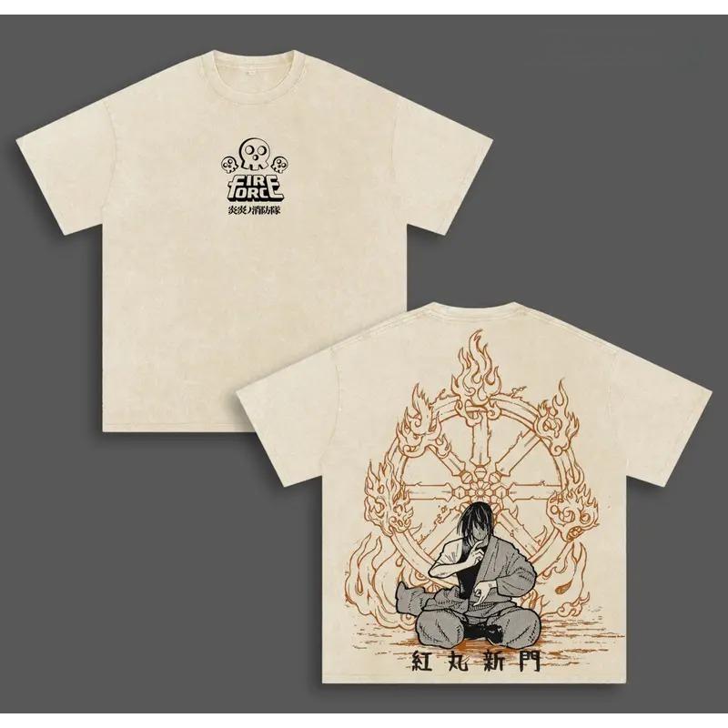 Hot Anime Fire Force Shinmon Benimaru Graphic Tee Men Vintage Clothing Washed Cotton Tshirt Casual T-shirt Harajuku Male T Shirt cm beige