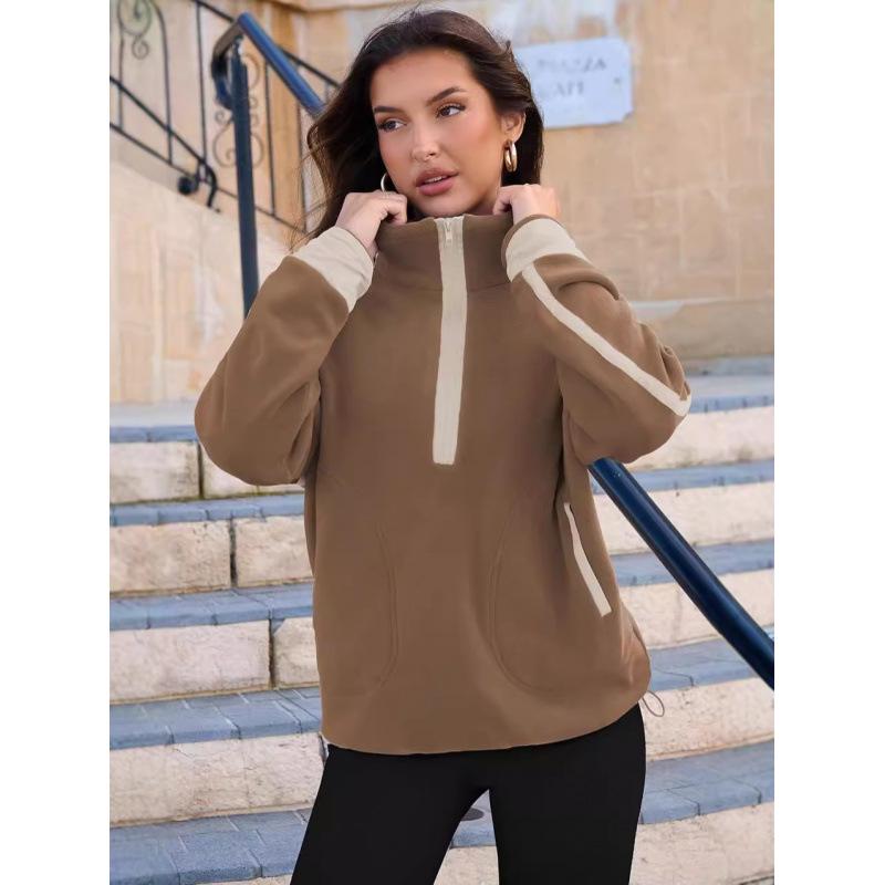 Women's Color Block Zip-Up Hoodie with Stand Collar and Pockets cm dark green