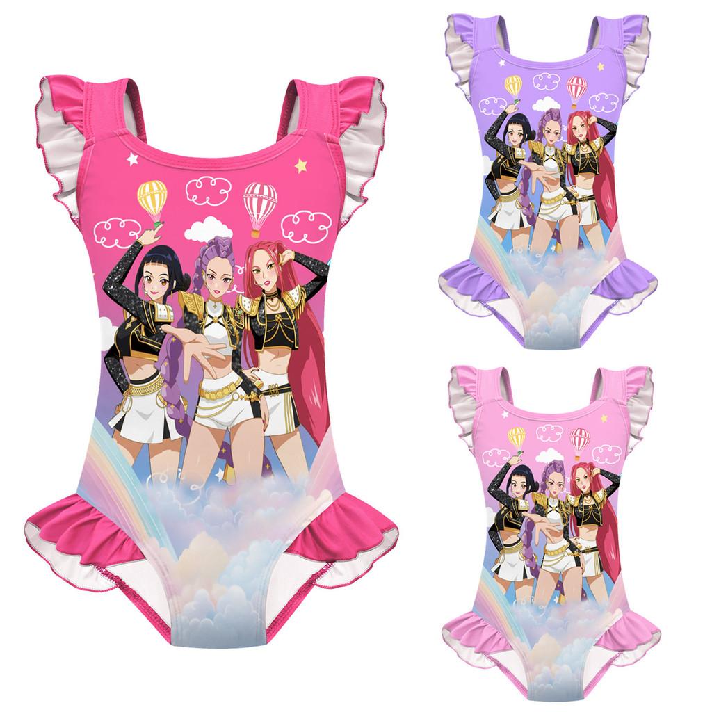 Kids Girls Anime Cartoon POP Singer Rumi Zoey Mira Print Ruffle Sleeveless One-piece Swimsuit Swimwear 110cm