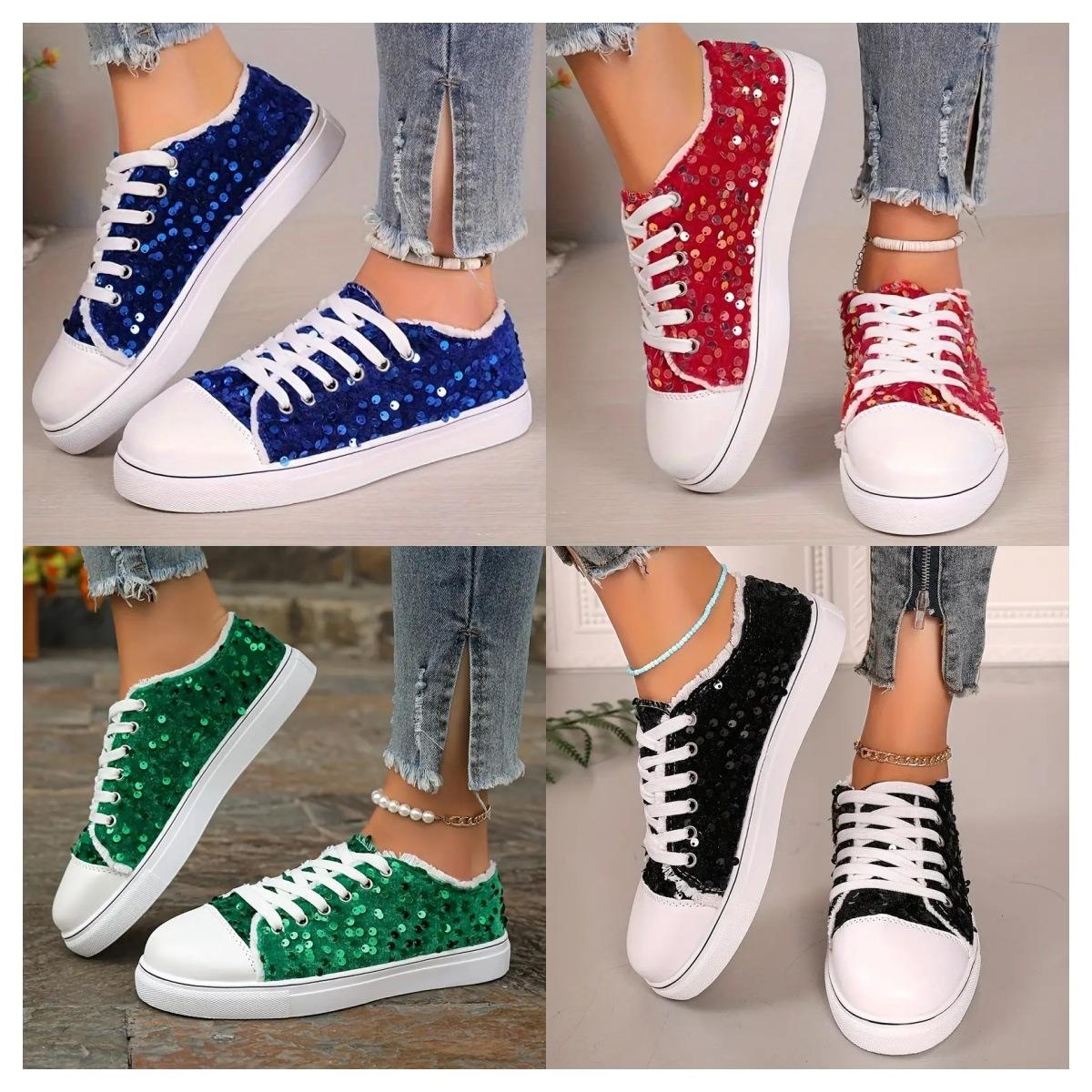 Foreign trade large size canvas shoes women's 2025 autumn new rough edge sequins shallow mouth low top flat bottom sports shoes cm green