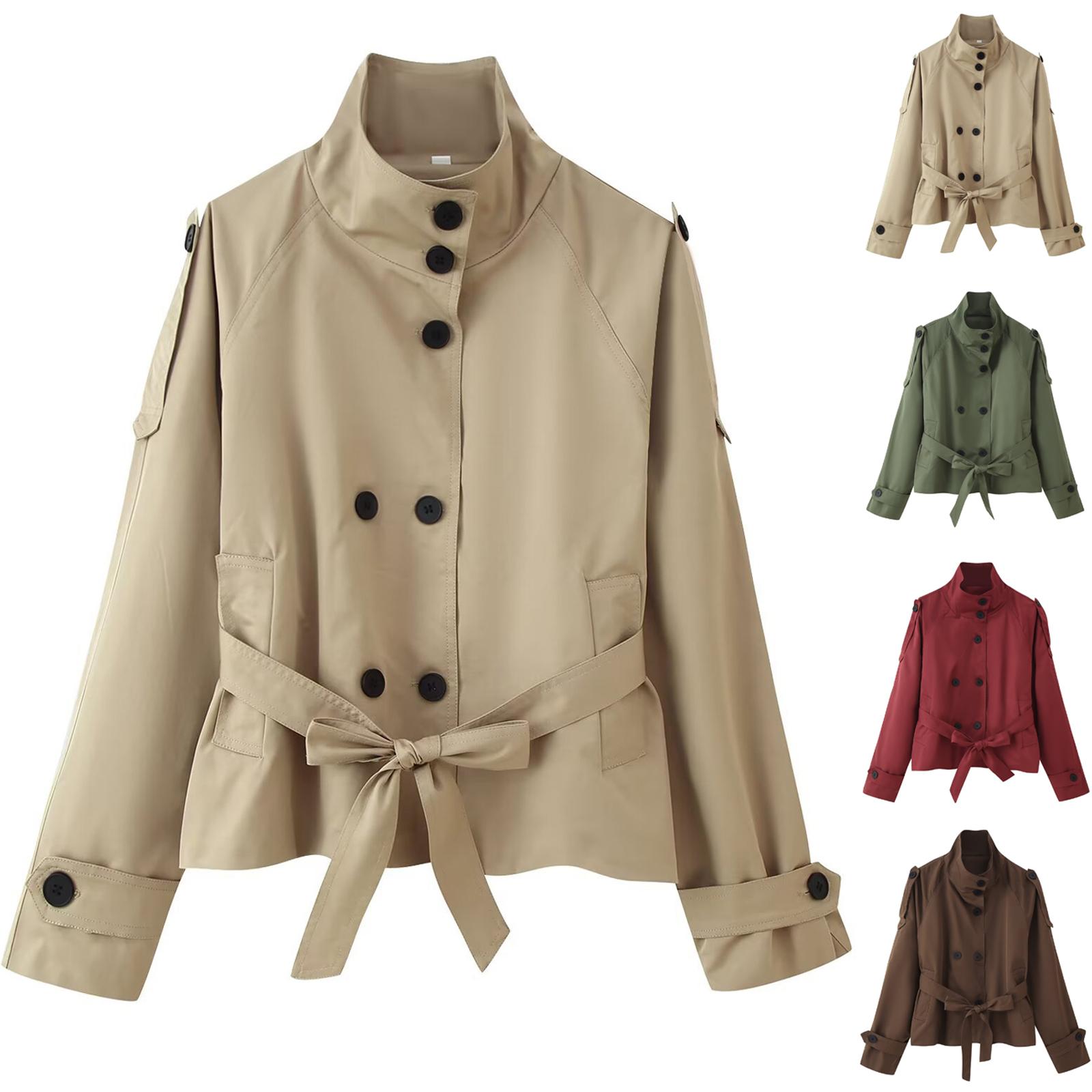Women's Cropped Trench Coat Double Breasted Short Jacket High Collar Fall Winter Coats Trendy Outfit With Belt cm coffee