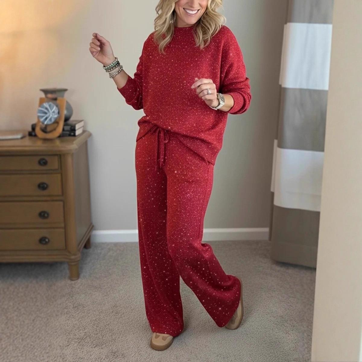 2 stk/sett Dame Topp Bukser Dress Fløyel Rund Hals Flaggermusermer Bluse Vide Ben cm mørk brun farge
