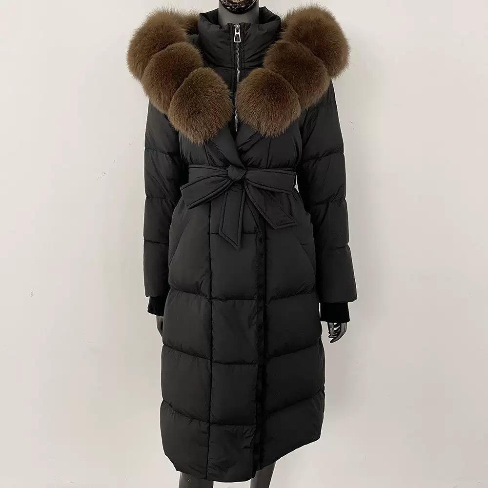 Damen-Winterjacke 2025, mittellang, Daunenjacke mit Fuchspelzkragen und Bindegürtel cm
