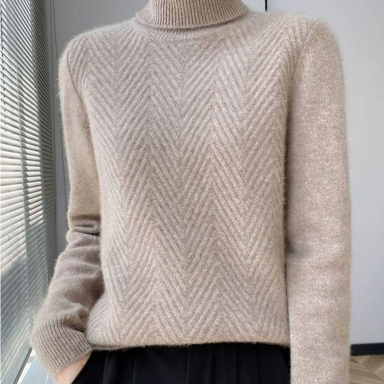 Autumn Winter Thick Pure Wool Sweater - High Neck Ribbed Detail Pullover, H-Silhouette Regular Fit Long Sleeve Top with Umbrella Hem cm black