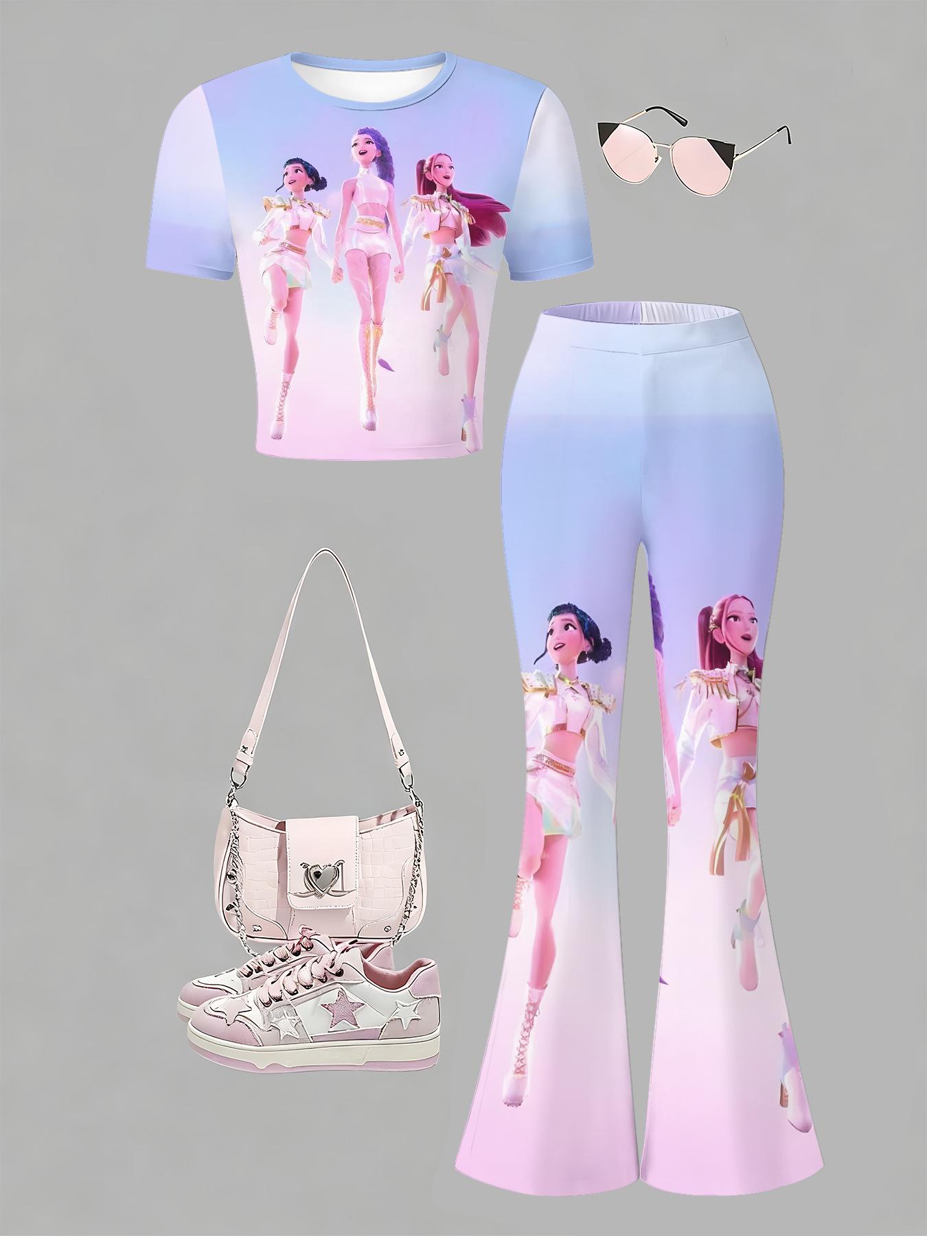 K-Pop Demon Hunter Flickors Utsvängda Byxset - Bekväma Kortärmade och Långa Byxor för Vår/Höst. cm blommig