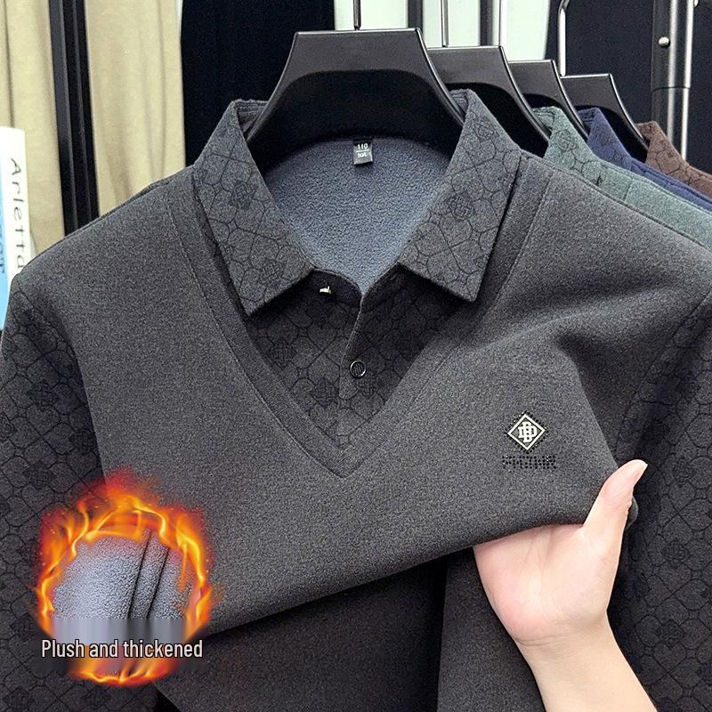 Men's Merino Wool & Silk Two-Piece Effect T-Shirt, Winter Fleece Lapel Base Layer. cm Dark blue