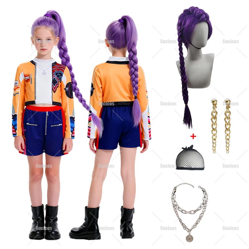 Costume Cosplay Filles Démons K-pop Chasseuse Rumi pour Enfants Perruque Boucles d'Oreilles Fête d'Halloween Ensemble de Vêtements Mode Accessoire Fan