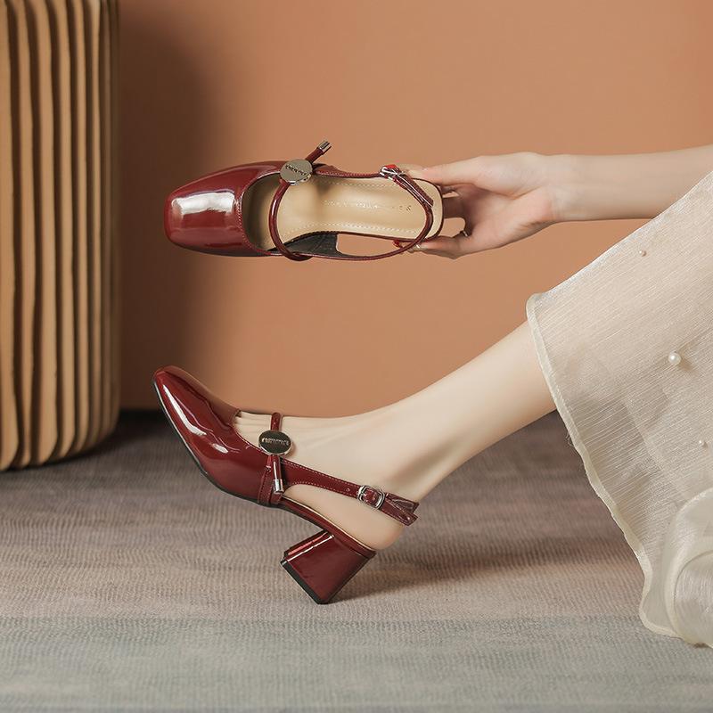 Leather 6CM Bag-toe Sandals for Women Mary Jane Fairy Style Summer Mid-heel French One-length Strap Thick Heel Short Shoes cm