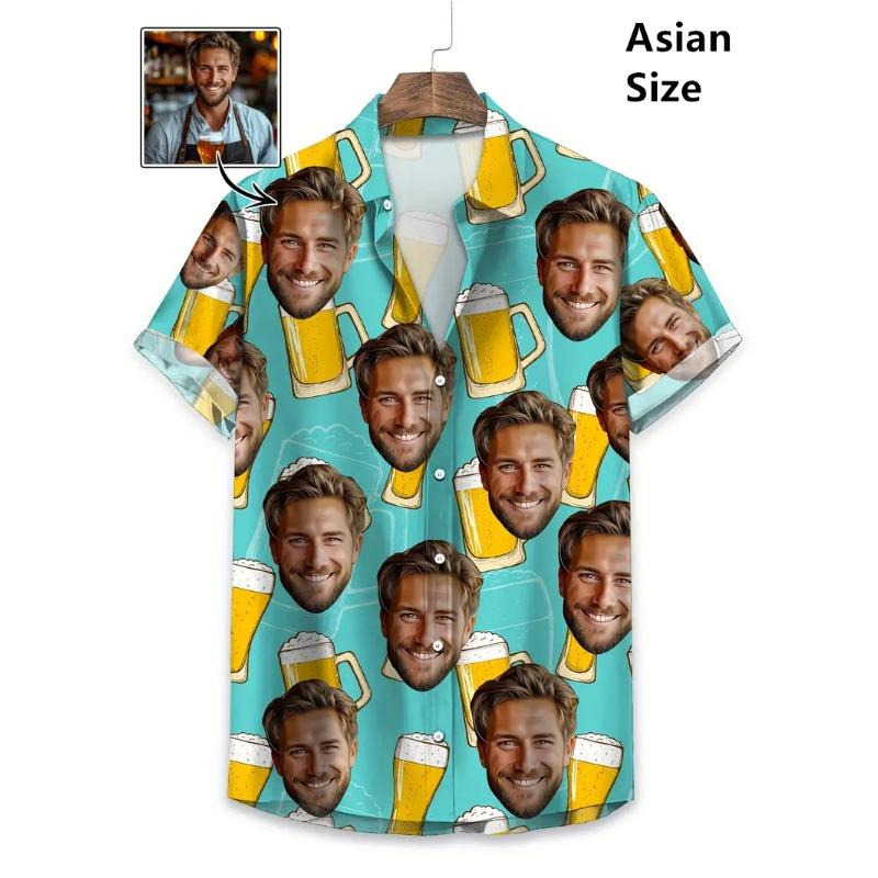 Gezicht Foto Bier Shirts Voor Mannen Kleding Custom 3D Print Hawaï Strandshirt Y2k Top 90s Vintage Kleding Kraag Korte Mouw Blouse cm
