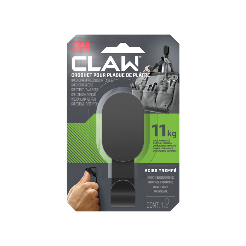 Crochet mural pour charges lourdes spécial plaque de plâtre 3M™ CLAW 11 kg, 1 crochet en métal noir