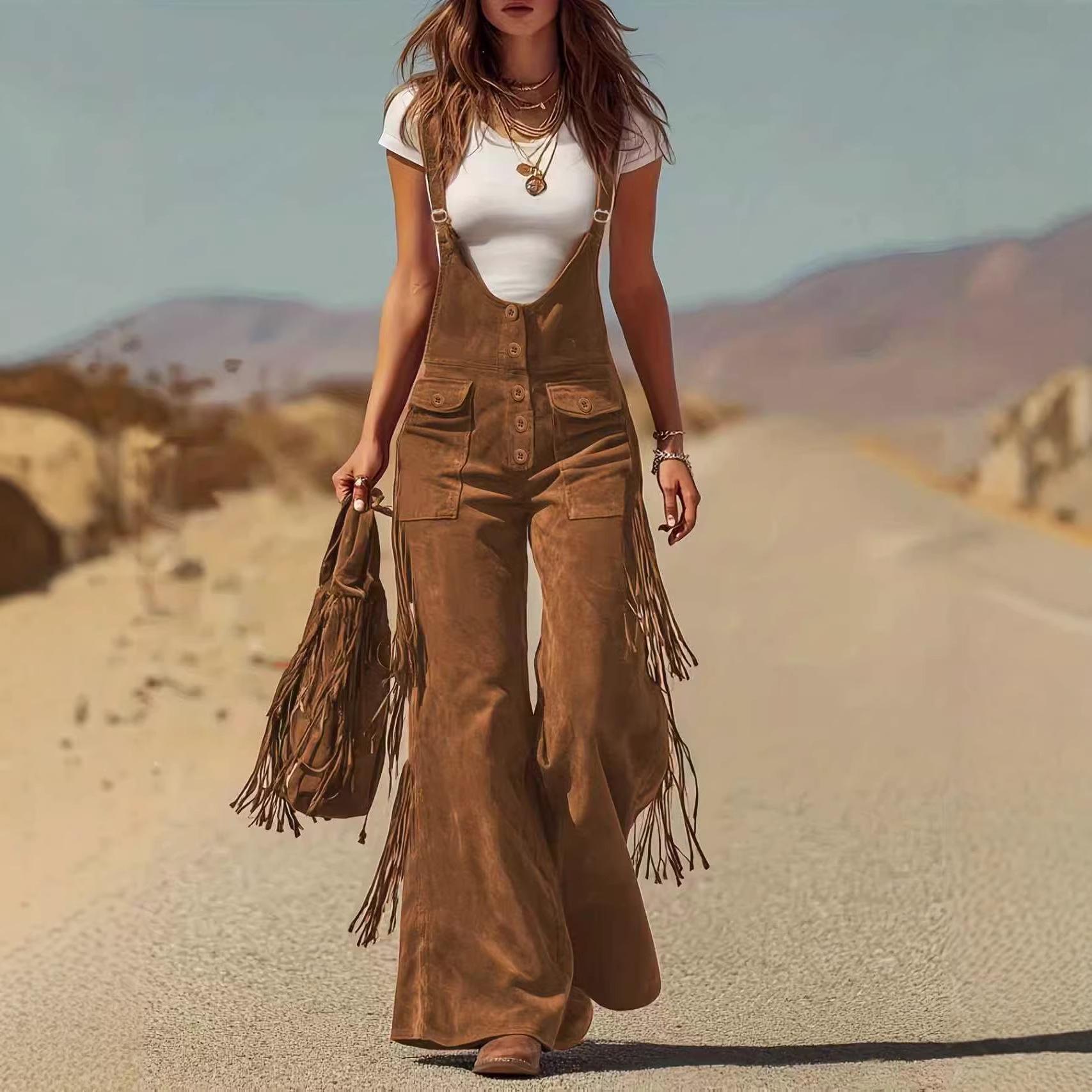 Retro Western Suede Tassel Wide-Leg Pocket Overalls cm wine red