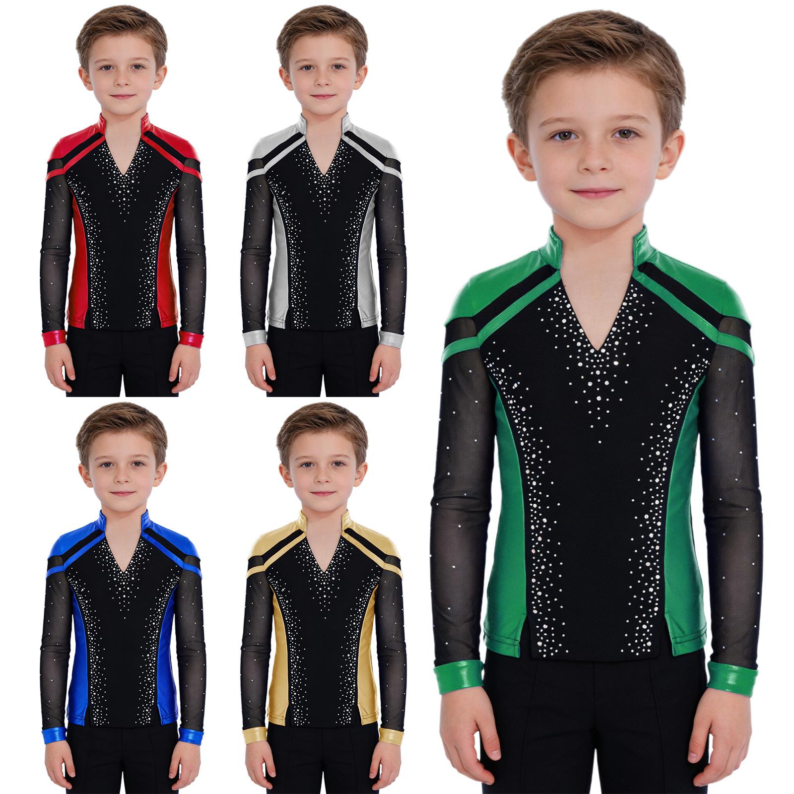 Boys Figure Skating Competition Top: V-Neck Long Sleeve Split Hem Shiny Rhinestones Metallic Color Block Design for Performance cm