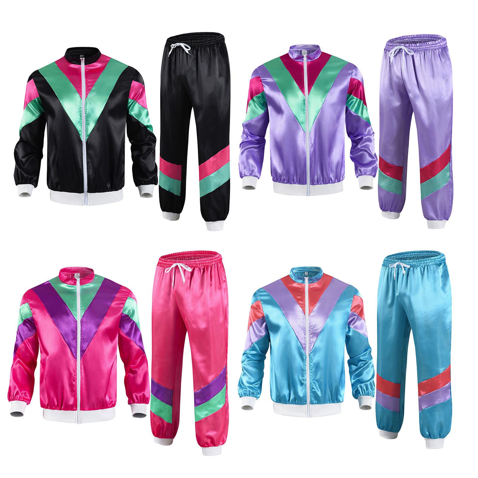 Womens 80s Theme Party Tracksuit Color Block Satin Sports Set Stand Collar Long Sleeve Zipper Jacket Drawstring Sweatpants cm sky blue
