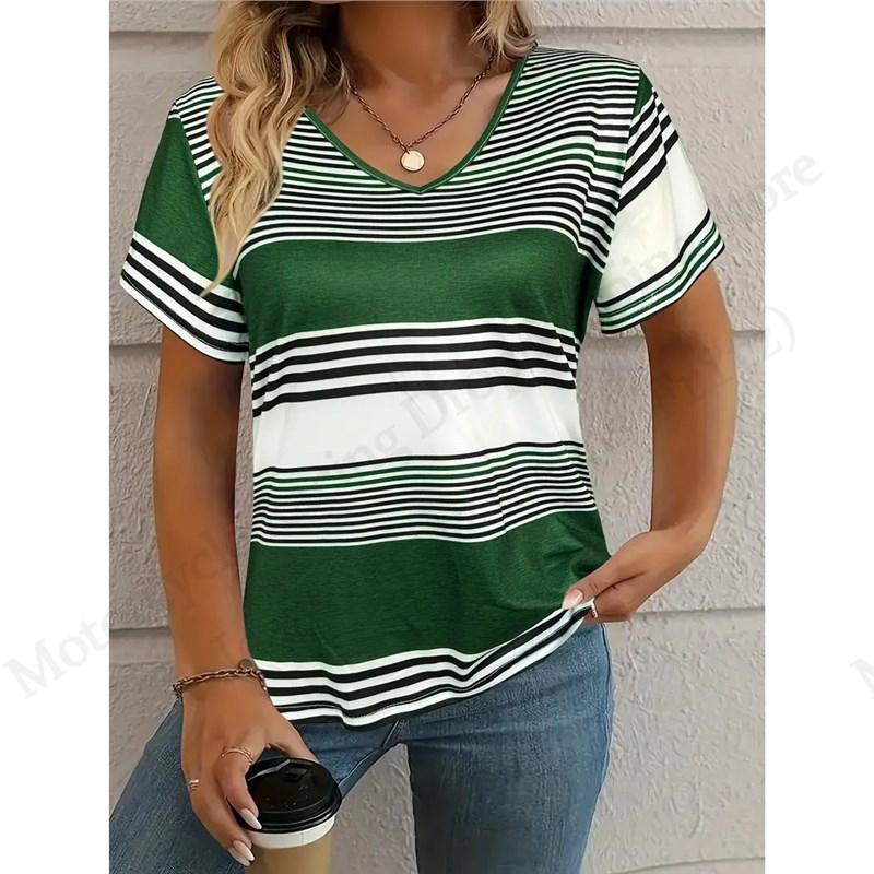 2025 Nieuw Dames T-shirt Gestreept Ruit 3D Print T-shirt Dames Mode Casual V-Hals Korte Mouw Tops Tees Dameskleding Dagelijks cm