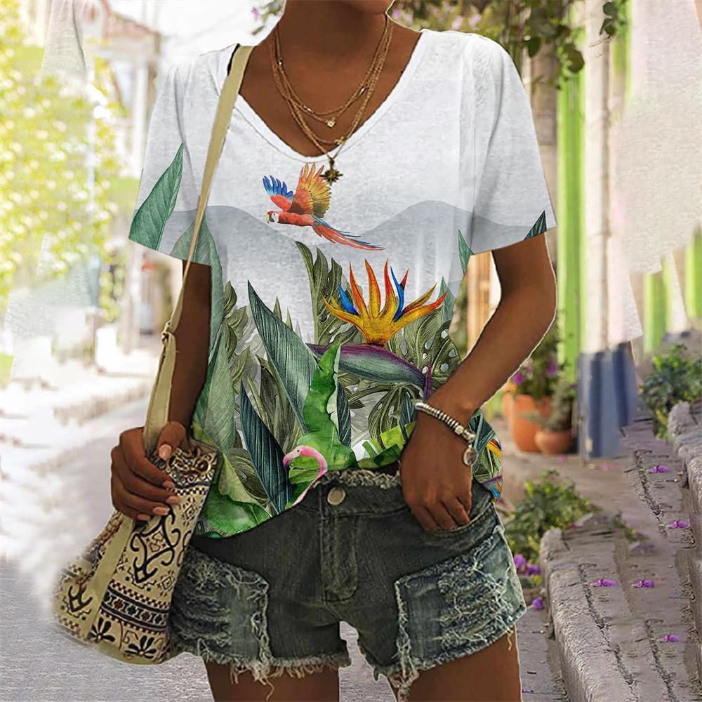 T-shirts d'été à col en V imprimés de plantes tropicales 3D, tendance et décontractés à manches courtes pour femmes cm