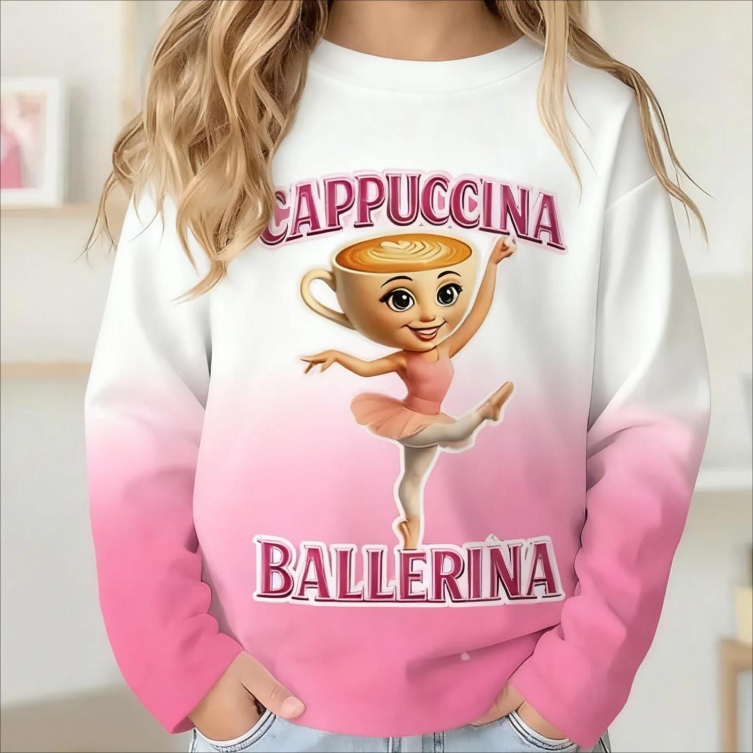 T-shirts à manches longues décontractés à la mode pour enfants et filles, imprimés 3D Cappuccina Ballerina à col rond pour le printemps et l'automne c