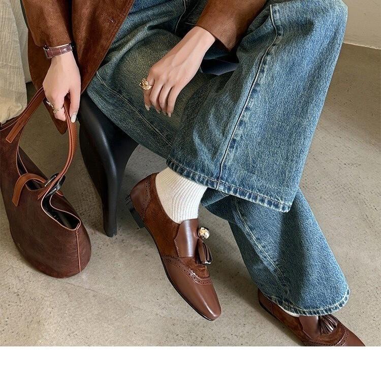 Soft leather version~ retro fringed round head loafers Brock engraved British style flat bottom one pedal small leather shoes women cm black