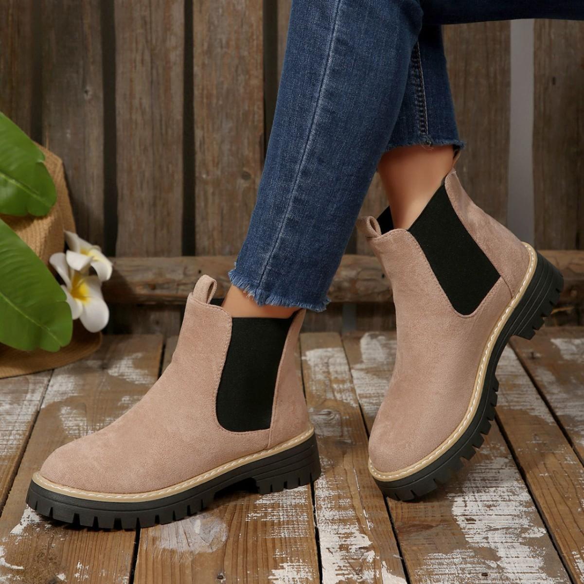 FOREADA Damesko Ekte Skinn Chelsea Boots Rund Tå Tykk Mellomhøy Hæl Plattform Korte Støvler Dame Mote Sko Høst Vinter Svart cm mandel