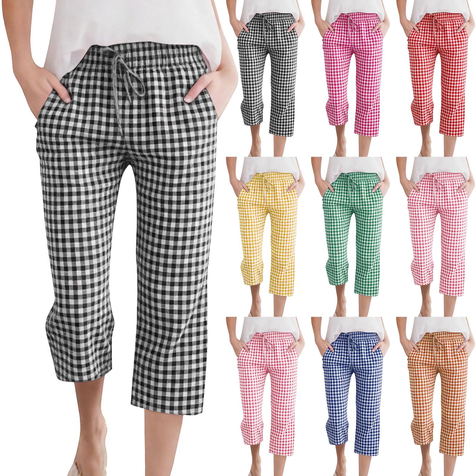 Women's Fashion Tartan Print Elastic Waistband Pocket Loose Casual Seven-Eighths 7/10 PantS cm red