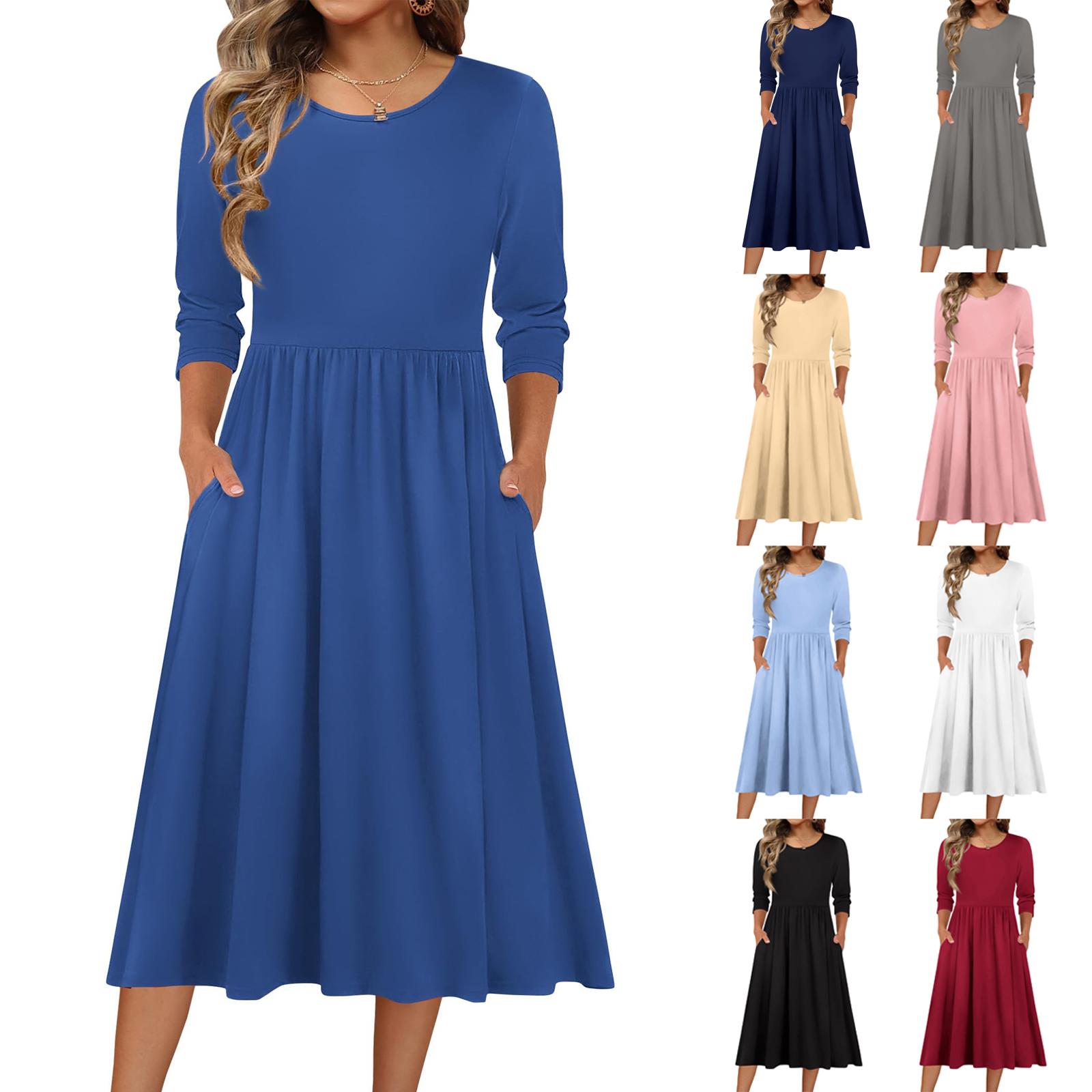 Sukienka damska z rękawem 3/4, codzienna, zwiewna, w kształcie litery A, midi, sukienka T-shirtowa z kieszeniami, z okrągłym dekoltem, wakacyjna, boho