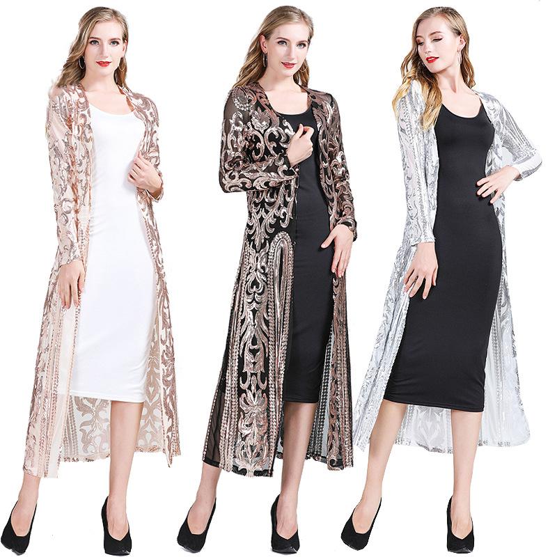Kvinnor Sexig Lång Paljett Öppen Fram Mesh Kofta Broderi Långärmad Blus Cover Up Kappa Kväll Bal Fest cm