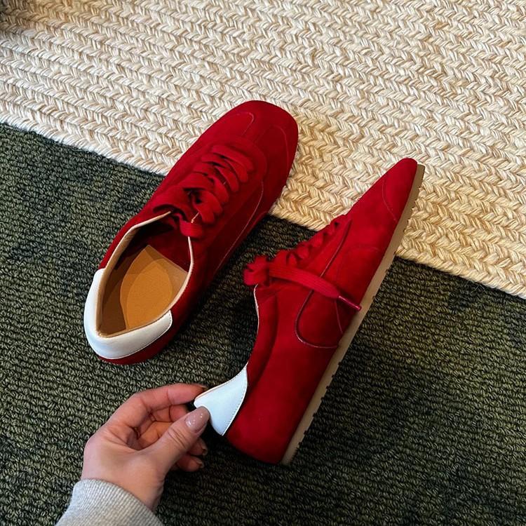 Version i kohud~ Äkta läder röda plattbottnade tyska träningsskor brittisk stil mångsidiga Forrest Gump-skor dam snörning rund tå vardag cm röd