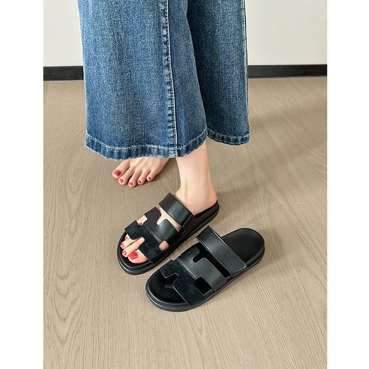 Classic color matching second uncle H slippers women's summer wear round head casual versatile Velcro flat bottom one word beach sandals cm khaki