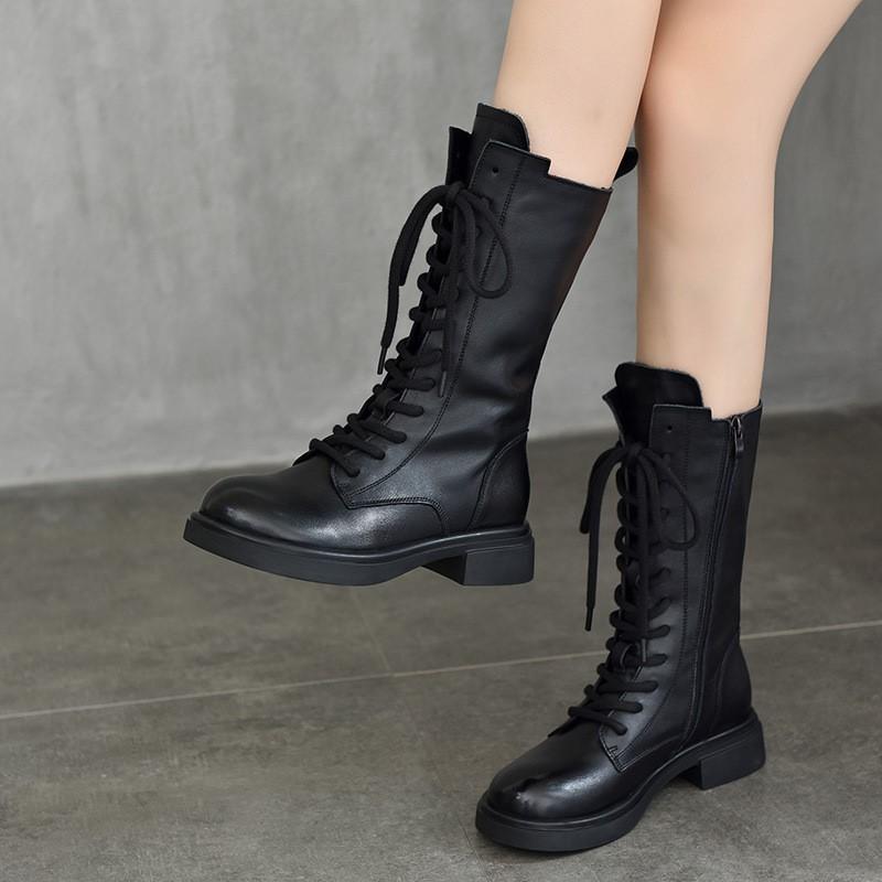 Johnature Genuine Leather High Boots Side Zipper Knight Boots Mid-calf Boots Plush Women's Boots cm black