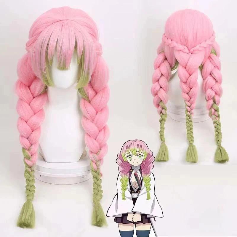 High Quality Mitsuri Kanroji Cosplay Wig Long Pink Green Braided Heat Resistant Hair Authentic Anime Cosplay Wigs + Wig Cap
