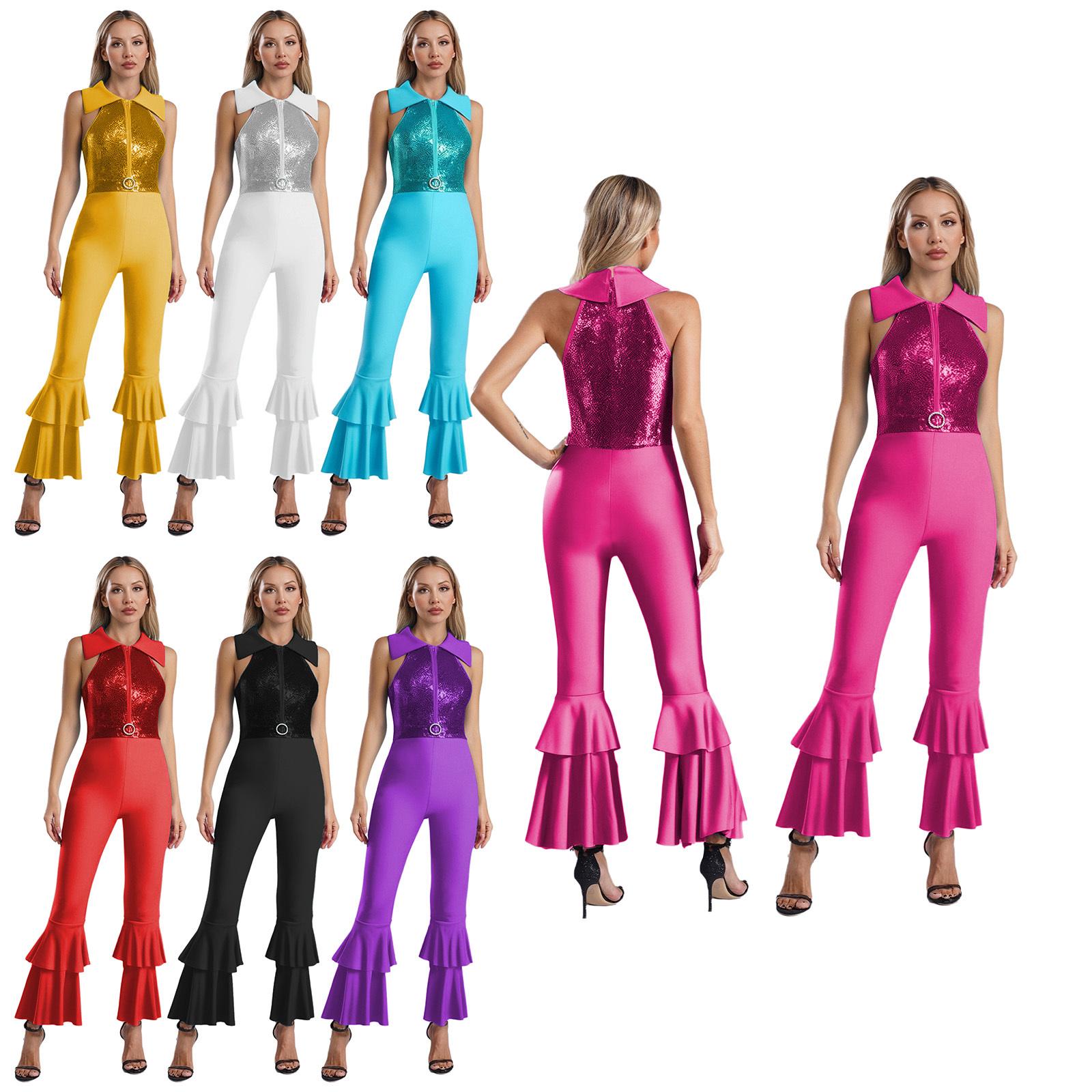 Dames Disco Jumpsuit Glanzende Pailletten Mouwloos Bell Bottom Design Strass O-Ring Accenten voor 70s Themafeesten cm zilver