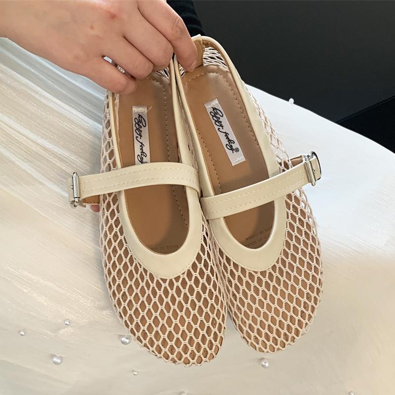 Fashion Breathable Air Mesh Flats Woman Lace Belt Buckle Shoes Ladies Hollow Out Mary Janes Summer Barefoot Lofers Femmes Grid Ballets cm