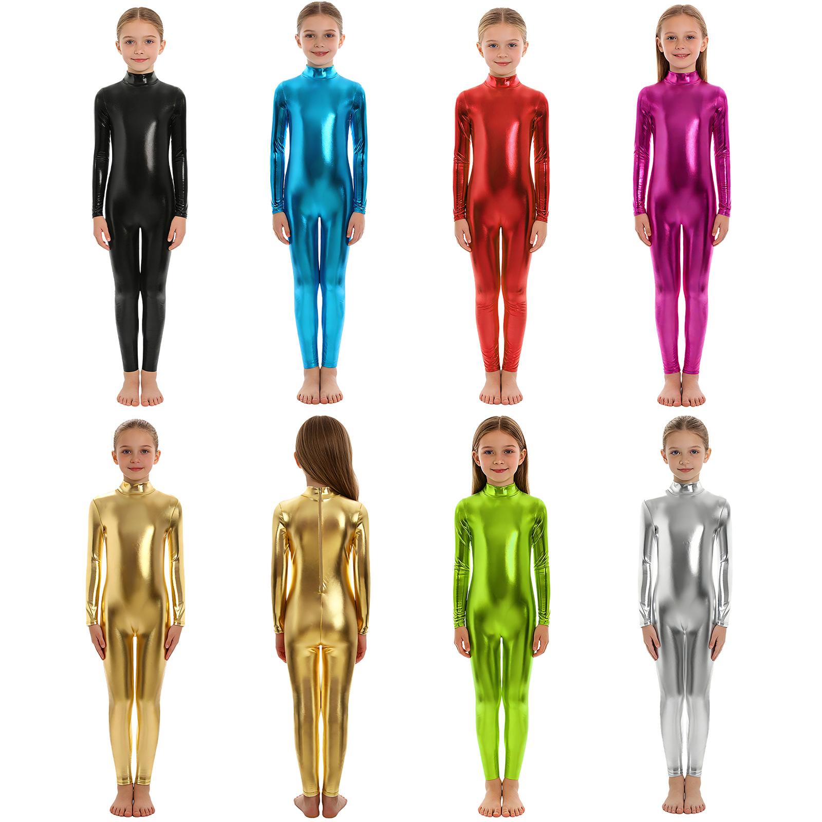 Unisex Kids Boys Girls Metallic Jumpsuit Halloween Role Play Dance Performance Costume Mock Neck Long Sleeve Full Length Leotard cm hot pink