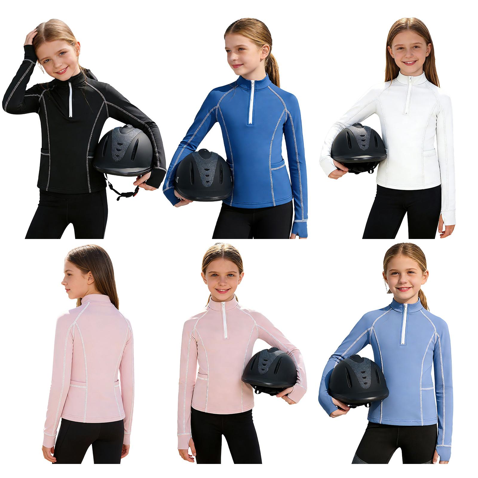 Koszulka do jazdy konnej dla dziewczynek: Sweter z zamkiem pod szyją, z długim rękawem, otworem na kciuk i kieszeniami, Top do sportów jeździeckich cm
