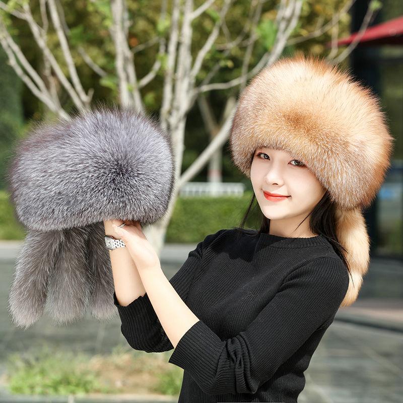Czapka z futra lisa damska zimowa futro z norki styl narodowy czapka mongolska prawdziwa skóra nauszniki czapka narciarska 56-58cm