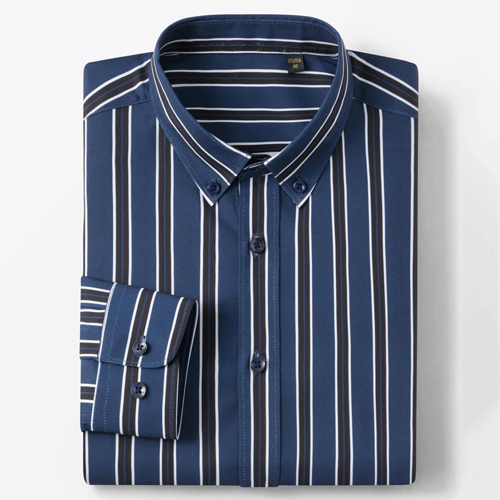 Mens 4-Way Stretch Collared Wrinkle-Free Button-Down Shirts, Business Casual Long Sleeve Silky Sheen Looking Striped Dress Shirt cm navy blue/white