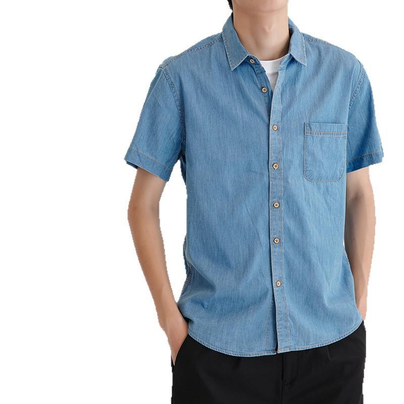 Men's Dark Blue Short Sleeve Denim Shirt - Contrast Stitch Casual Button Down with Pocket cm