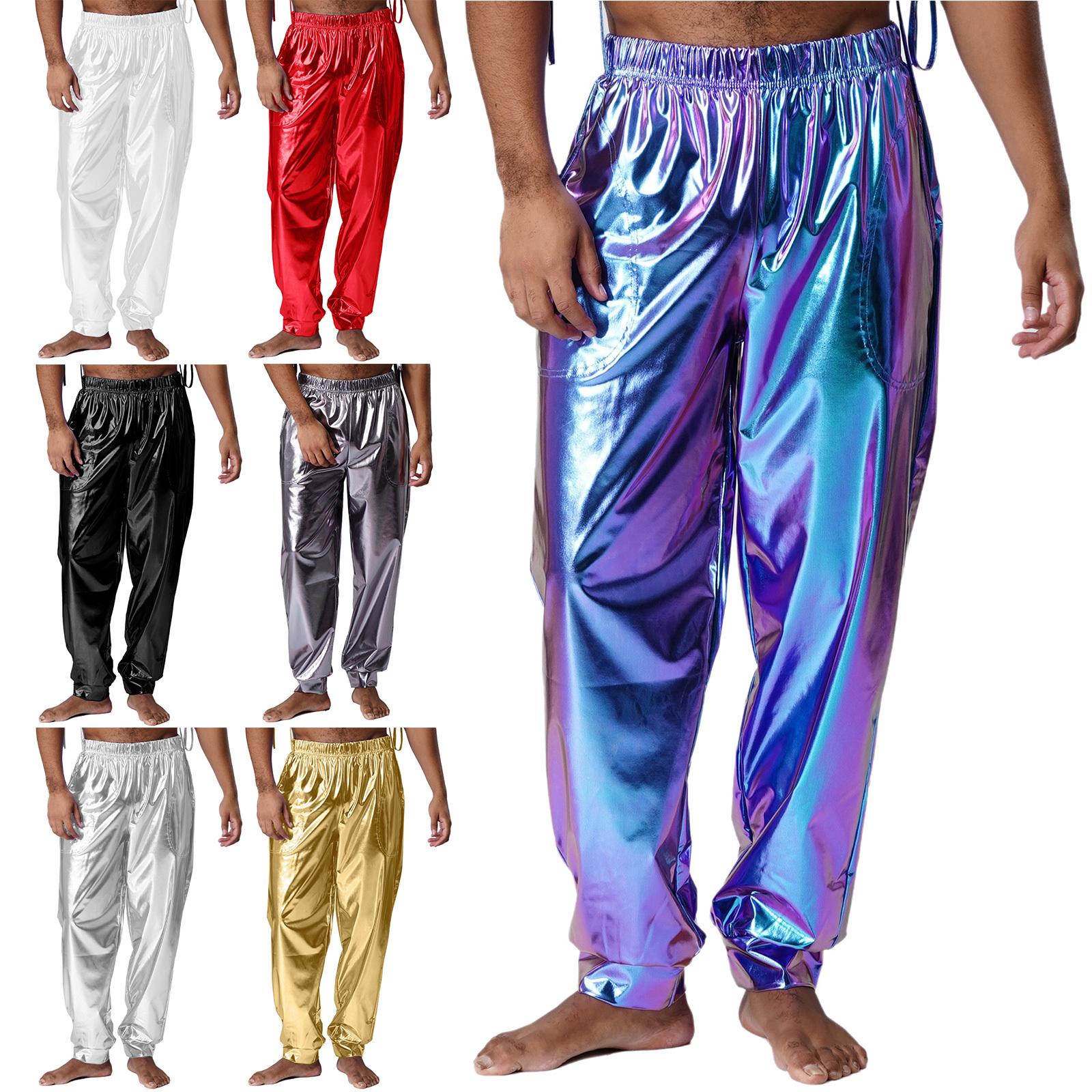 Pantalon Métallique Taille Haute pour Homme M-XXL: Pantalons de Sport Brillant à Taille Élastique pour Danse Moderne, Spectacle sur Scène et Tenue de