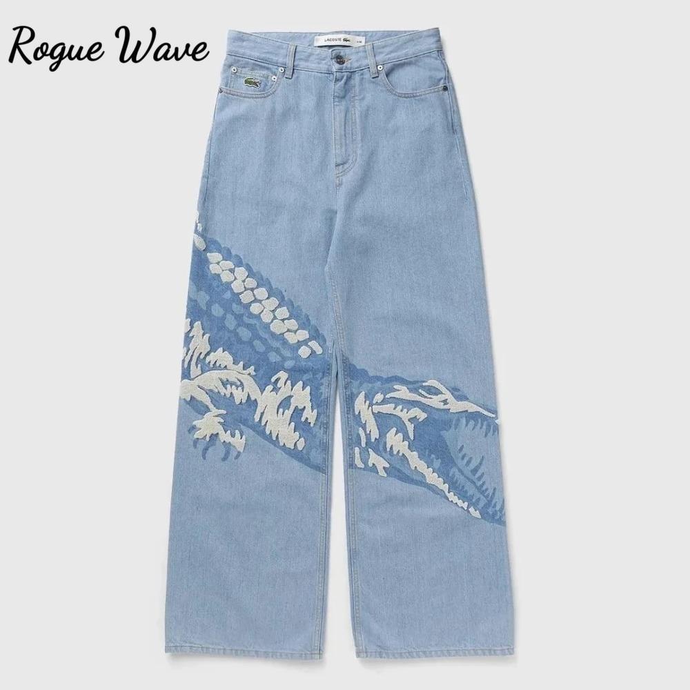 RogueWave Streetwear Hüftjeans Weitbein Hose Herren Damen Retro Blau Harajuku Krokodil Grafik Baggy Jeans Goth Denim Hose cm