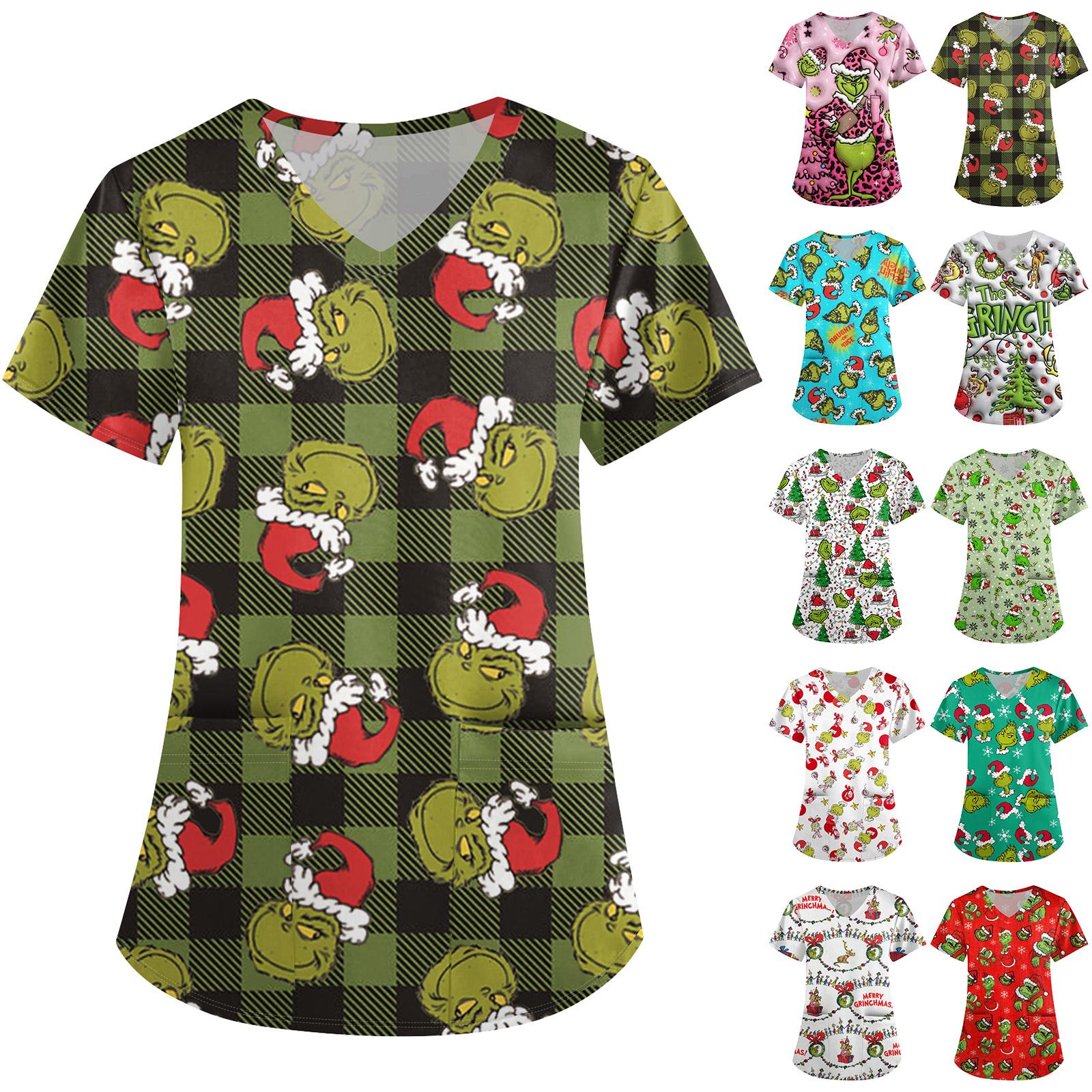 Plus SizePrinted Scrub Working Uniform Tops For Women's Cross V-Neck Print Short Sleeve Fun T-Shirts Workwear Tee With Pockets cm