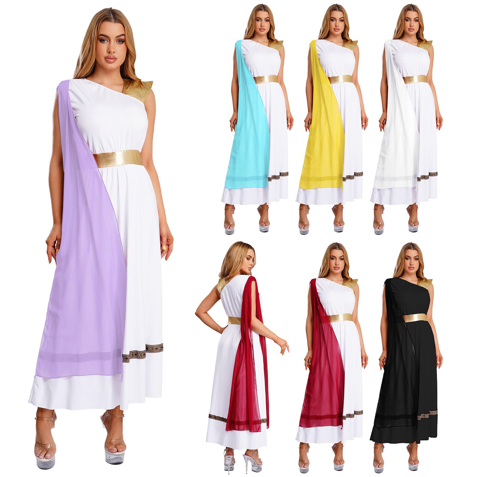 S-3XL Costume de Princesse Grecque Antique pour Femme Sans Manches Taille Haute, Robe Toge d'Impératrice Romaine Dorée pour Halloween & Soirée Cosplay