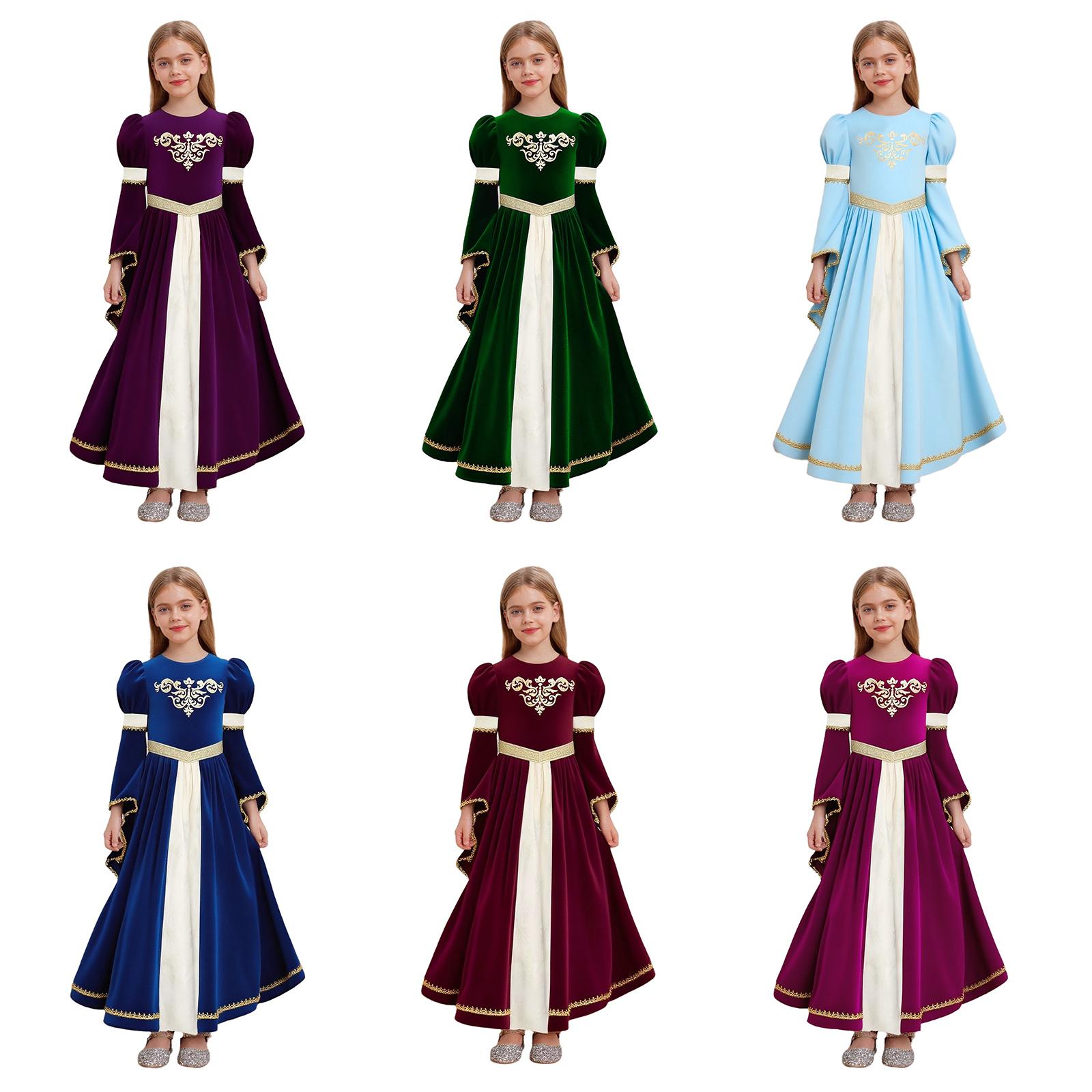 Kids Girls Medieval Princess Costume Patchwork Round Neck Bell Sleeve Chest Gold Pattern Print Waist Decorative Band Design Ruffled Webbing Trim Long