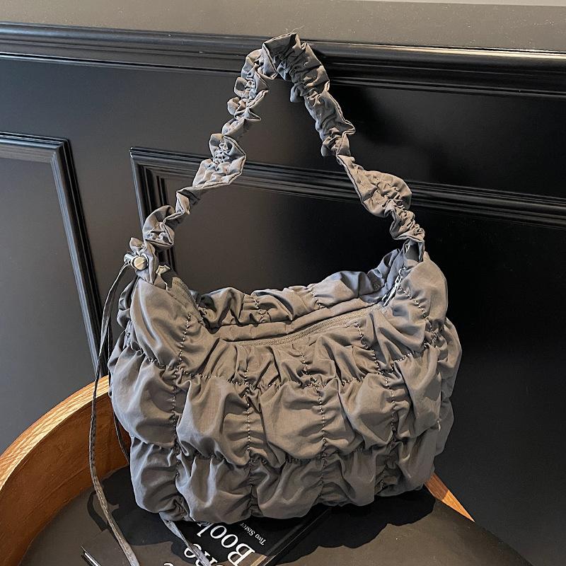 Women's Pleated Draped Strap Crescent Tramp Bag Nylon Casual Shoulder Drawstring Cloud Bag gray