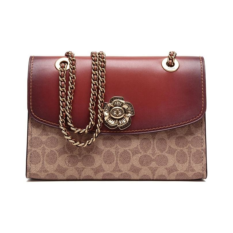 COACH Parker 26 klassiek oud-bloemen camelia print ketting gecoat canvas handtas schoudertas dames gelig bruin baby hertje
