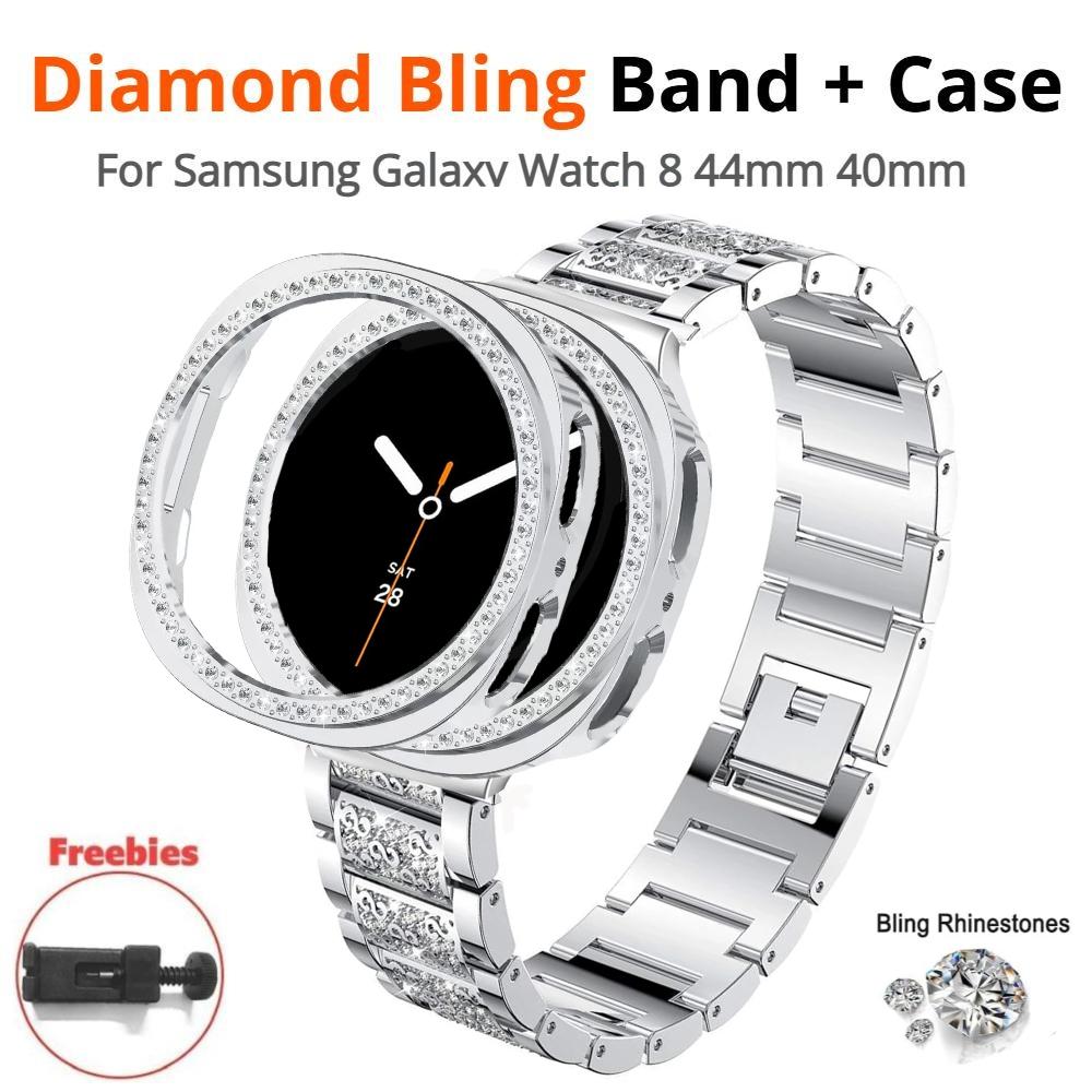 Diamanten Metalen Band Voor Samsung Galaxy Watch 8 40mm 44mm Bling Armband Band+PC Beschermhoes Voor Samsung Galaxy Watch8 Classic 46mm Banden roze