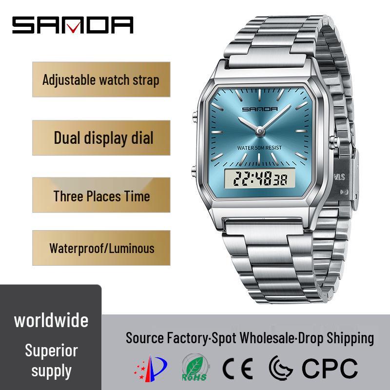 Sanda Męski Wodoodporny Retro Modny Stalowy Pasek Podwójny Wyświetlacz Wielofunkcyjny Elektroniczny Zegarek na Rękę